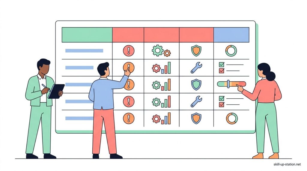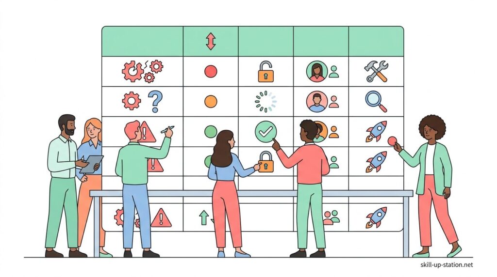 各課題には担当者を1名割り当て、解決期限を日付で設定し、対応状況を「未着手」「対応中」「完了」の3段階で更新します。さらに、影響範囲を納期遅延日数や対象機能数で数値化し、優先度を高・中・低のいずれかで判断できる状態にします。