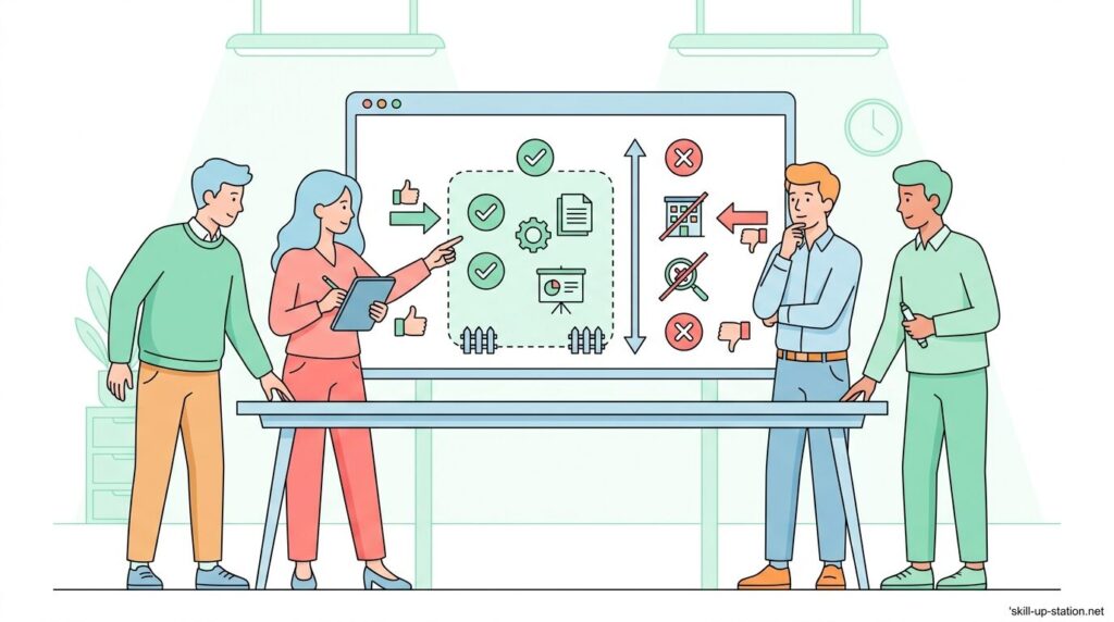 例えば、ログイン機能であれば、メールアドレスとパスワードでの認証を対象とし、SNS連携は対象外と記載し、正常にログインできることを完了条件として設定します。対応範囲を確定する際には、関係者全員が同じ内容で合意できるように、項目ごとに確認を行い、承認日と承認者名を記録します。