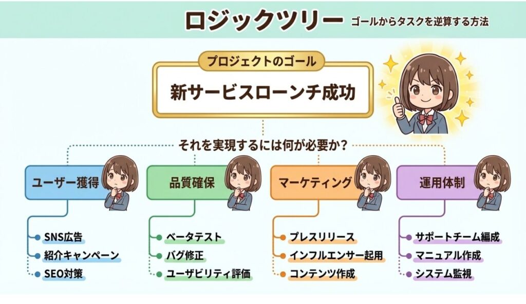 ロジックツリーは、目的や成果物から必要なタスクを逆算して整理する方法です。