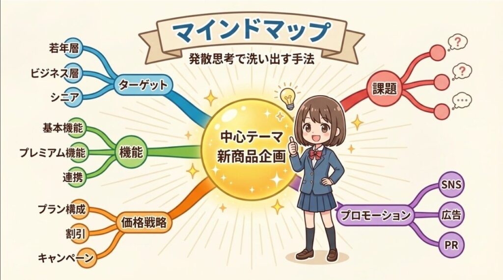 マインドマップは、中心テーマから関連する要素を広げていく図解手法です。