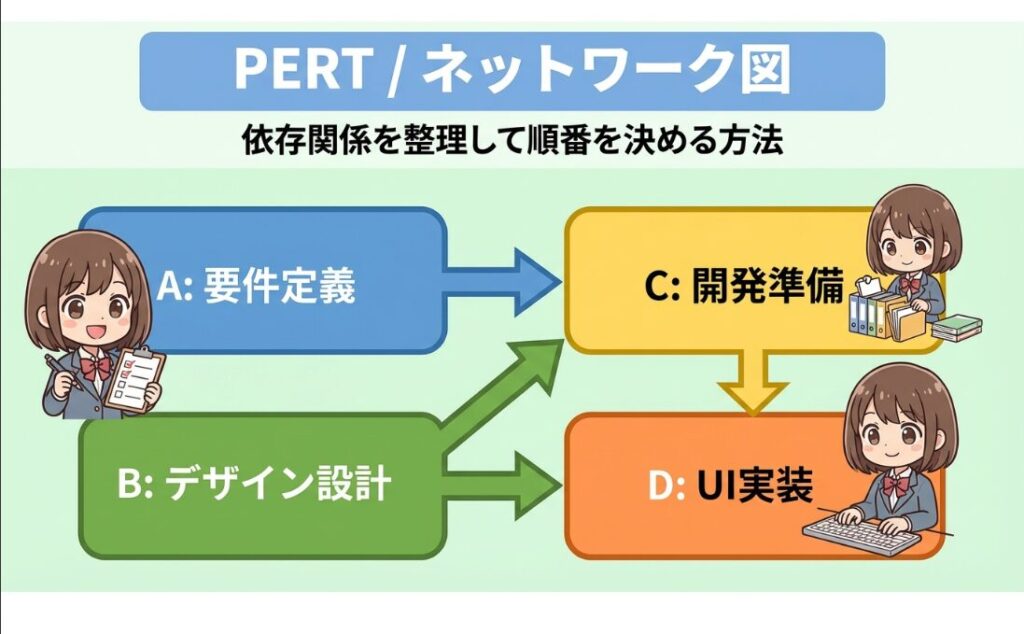 PERT やネットワーク図は、タスク同士のつながりや並行できる作業を整理し、作業順序を見える化する手法です。