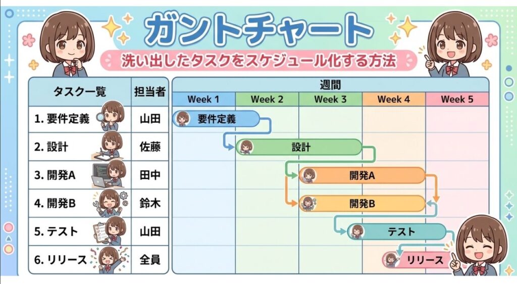 どの作業がどの順番で進むのかが見えることで、計画の精度が上がり、チーム全員の共通認識が生まれます。
