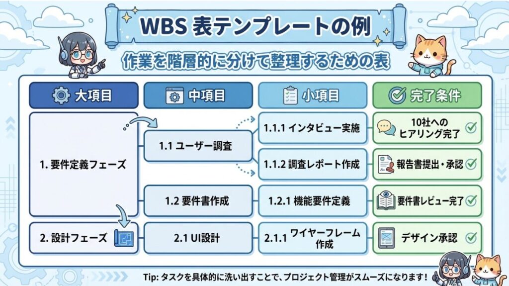 WBS のテンプレートは、作業を階層的に分けて整理するための表です。