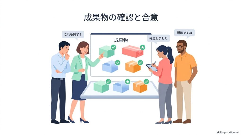 具体的には、成果物の種類、数量、形式、完成条件、納品日を数値と条件で定義し、誰が見ても同じ基準で完成と判断できる状態にします。