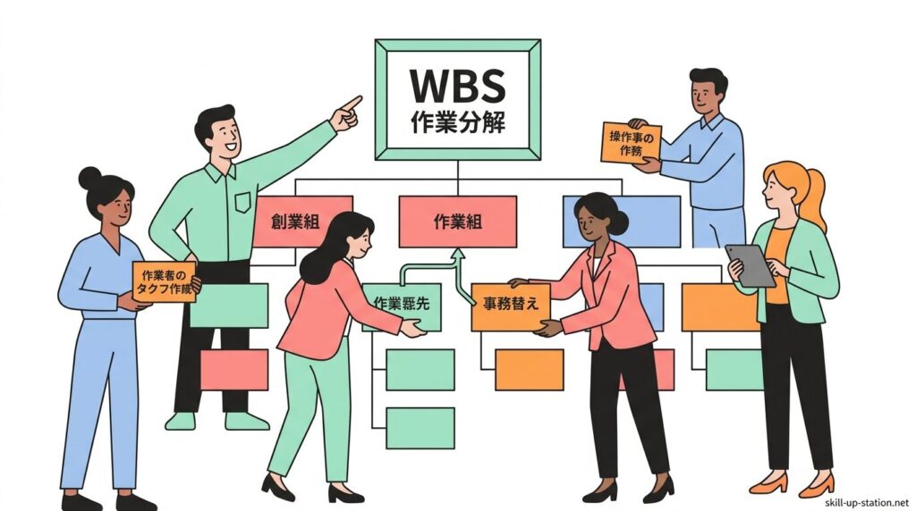 WBS作成による作業範囲の整理では、確定した成果物を基に作業を最小単位まで分解し、すべての作業を一覧化して範囲を明確にします。