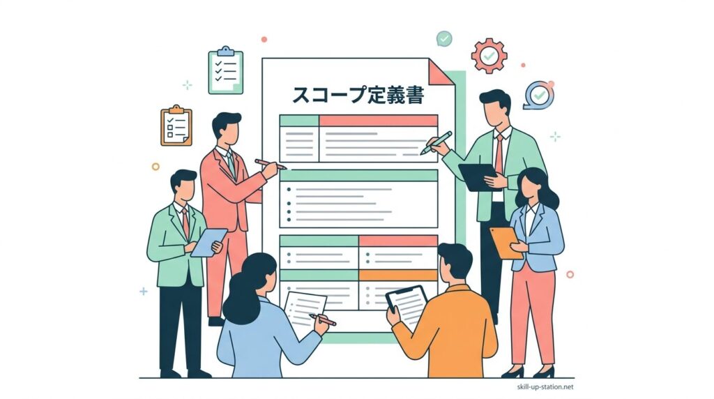 スコープ定義はプロジェクト開始前に「成果物の内容」「作業範囲」「対象外項目」「納期」を数値と条件で確定し、文書として固定する作業です。