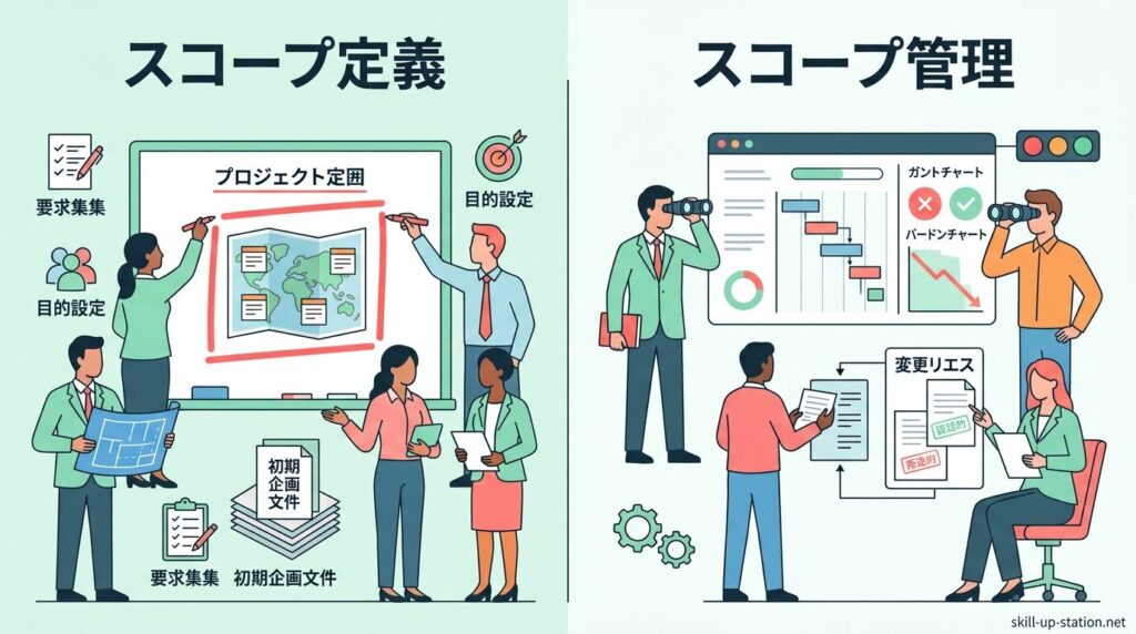 このように、開始前に範囲を決めるのがスコープ定義、進行中に範囲を維持するのがスコープ管理という違いがあります。