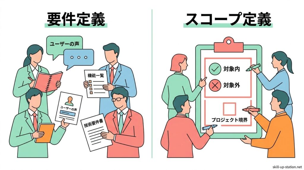 また、スコープ定義は開始前に範囲を決める工程であり、進行中に範囲を維持・調整するスコープ管理とは役割が異なります。さらに、要件定義が「実現したい内容の洗い出し」であるのに対し、スコープ定義は「その中から実施する範囲を確定する工程」である点も重要な違いです。