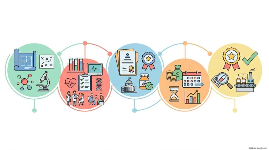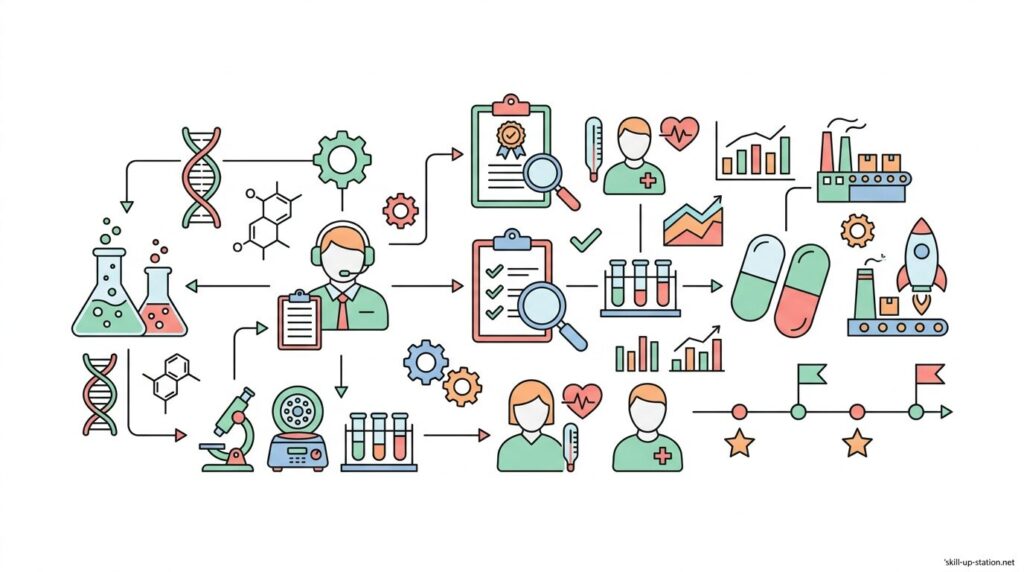製薬プロジェクトマネージャーは、創薬初期の基礎研究から臨床試験(第Ⅰ相〜第Ⅲ相)、承認申請、上市後の安全性監視まで、最短でも5年、長い場合は10年以上続く開発全体を一貫して管理する役割を担います。
