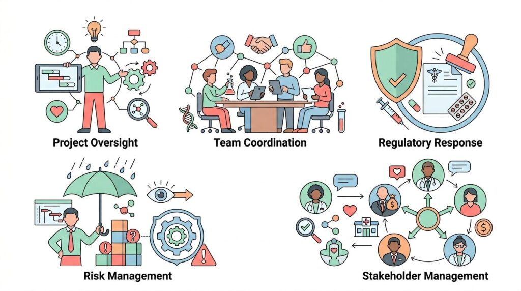 ここでは、こうした役割の中でも特に重要となる進行管理、部門間調整、そして製薬特有の管理ポイントについて具体的に整理していきます。