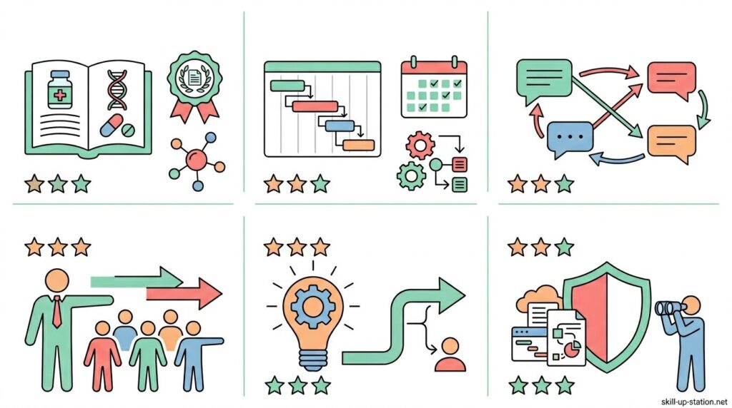 製薬プロジェクトマネージャーには、単なる進行管理のスキルだけでなく、医薬品開発特有の専門知識と、複数部門をまとめる実務的なマネジメント能力の両方が求められます。
