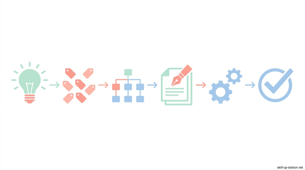 ここでは、SEOライティングの記事を0から作るときに、どの順番で進めれば迷わず書けるのかを、順を追って説明していきます。