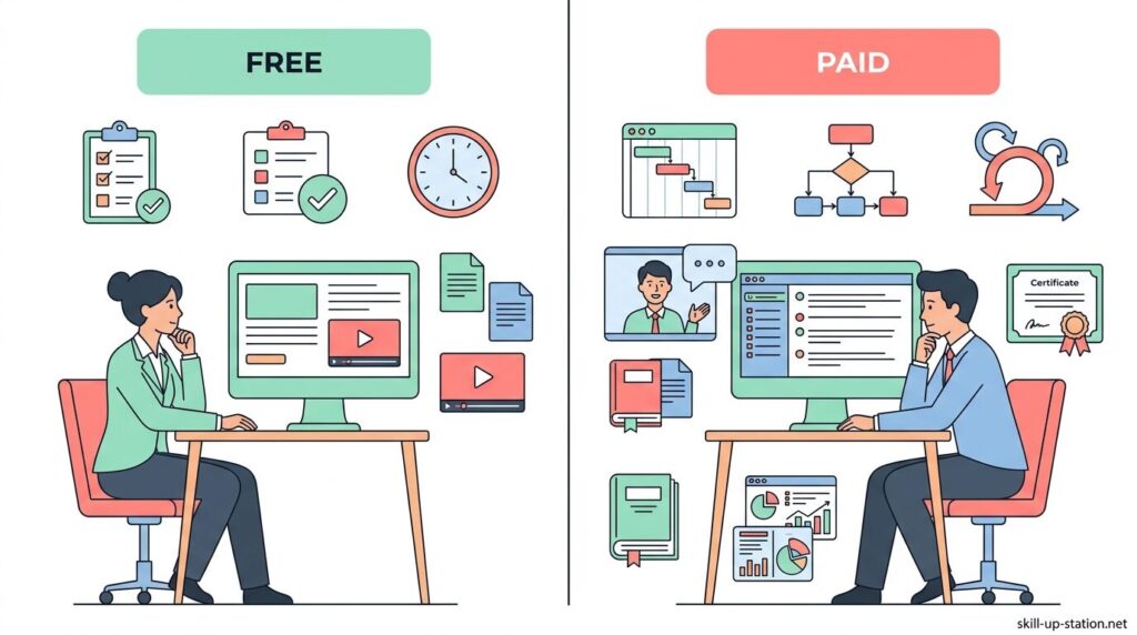 「オンラインで学べるプロジェクトマネジメント講座って、実際にどんな内容を学ぶの?」「無料と有料って何が違うの?」「仕事に活かせるレベルまで身につくのかな?」と感じている方も多いのではないでしょうか。
