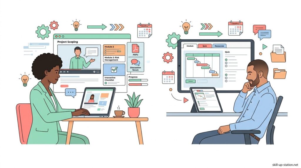 プロジェクトマネジメントをオンライン講座で学ぶ場合、通学時間が不要で1回30分〜90分の講義を自宅や通勤中に受講できる一方で、対面指導がないため理解度の確認や強制力に差が出るなど、学習環境の条件が大きく変わります。