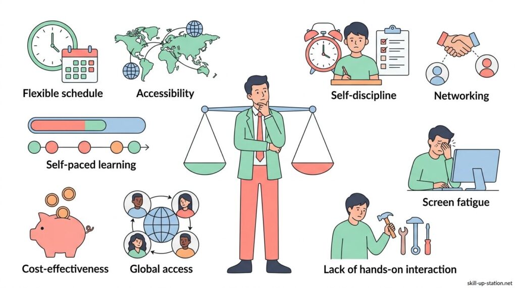 オンライン講座は、1本10分〜30分の動画を繰り返し視聴できるため、自分のペースで学習を継続しやすく、移動時間を削減できる点がメリットです。一方で、学習時間を確保できないと進捗が止まりやすく、質問対応や実践機会が不足すると理解が作業レベルまで定着しにくい点がデメリットになります。