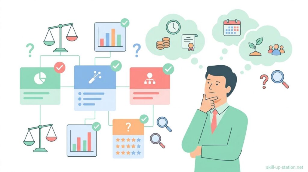 目的に対して必要な管理範囲が一致していない講座を選ぶと、実務で使う手順が不足するため、受講後に管理精度が上がらない状態になります。