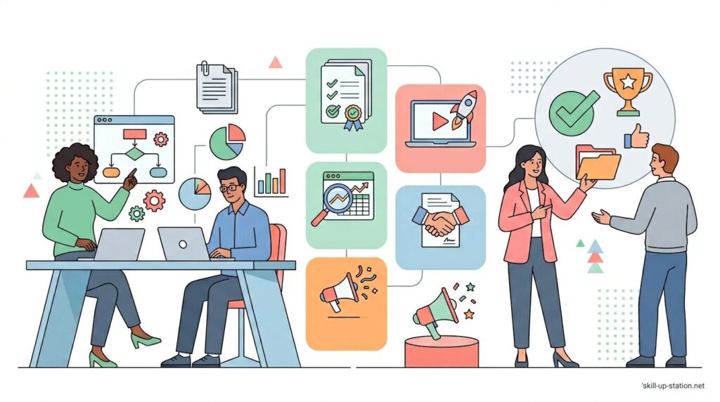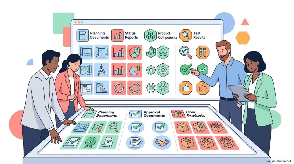 プロジェクトマネジメントの成果物とは、プロジェクトの開始から完了までの各段階で、誰が何を決め、何を作り、どこまで進んだかを文書やデータとして残したものです。