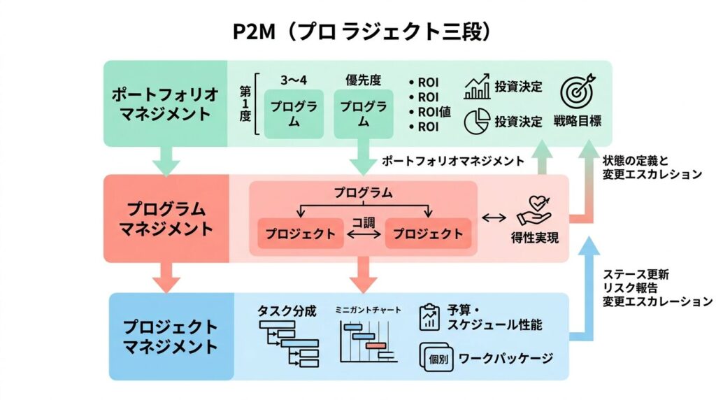 P2Mは、複数のプロジェクトを「プログラム」として束ね、全体の目的に対してどの案件を実行するかを選択しながら管理する手法です。
