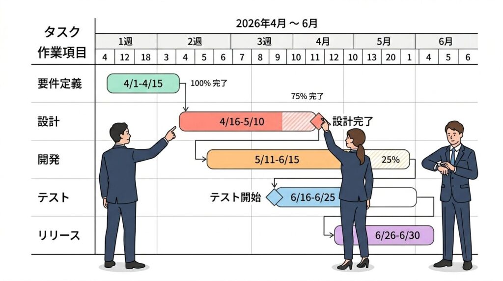 たとえば、1か月の開発案件であれば、初日に全体作業を細かく分解し、各タスクに対して担当者1名と完了日を設定し、週1回の進捗確認で遅れが発生していないかを確認し、遅れが出た場合は当日中に調整を行う、といった一連の手順を事前に定めて実行します。
