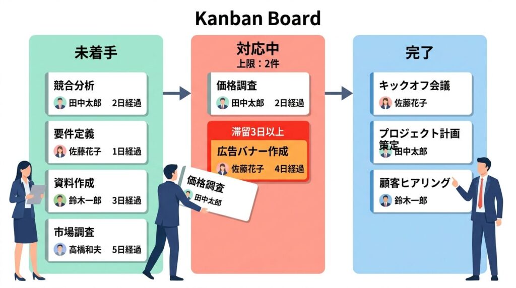 カンバンは、作業を「未着手」「進行中」「完了」などの列に分け、カードを移動させることで進捗を日単位で管理する手法です。