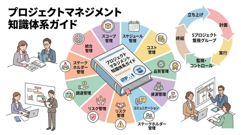 PMBOKは、プロジェクトを「立ち上げ」「計画」「実行」「監視・コントロール」「終結」の5つのプロセス群に分け、さらに10の知識エリアごとに作業手順を定めて進める管理手法です。