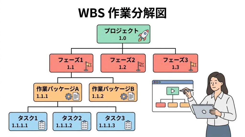 WBS(Work Breakdown Structure)は、プロジェクト全体の作業を最小単位まで分解し、各作業に担当者1名と開始日・完了日を設定する手法です。最初に最終成果物を定義し、その成果物を完成させるために必要な作業を順番に分解し、1つの作業が1日から3日程度で完了する単位になるまで細かく分けます。