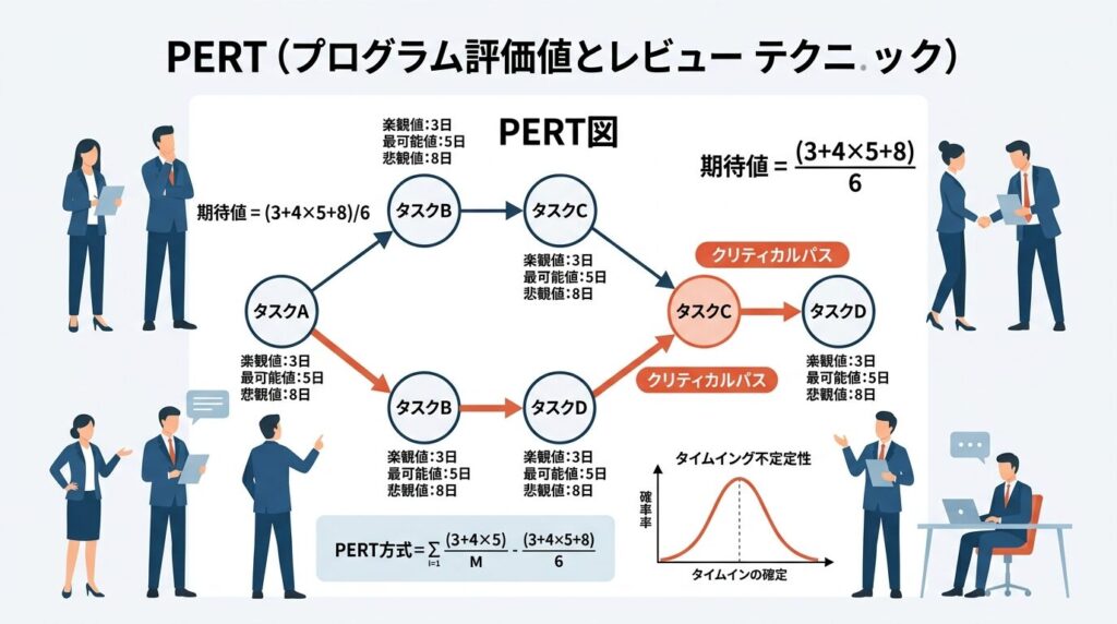 PERT(Program Evaluation and Review Technique)は、各作業の所要時間を「最短時間」「最も可能性が高い時間」「最長時間」の3つで見積もり、期待時間を算出して全体のスケジュールを決める手法です。
