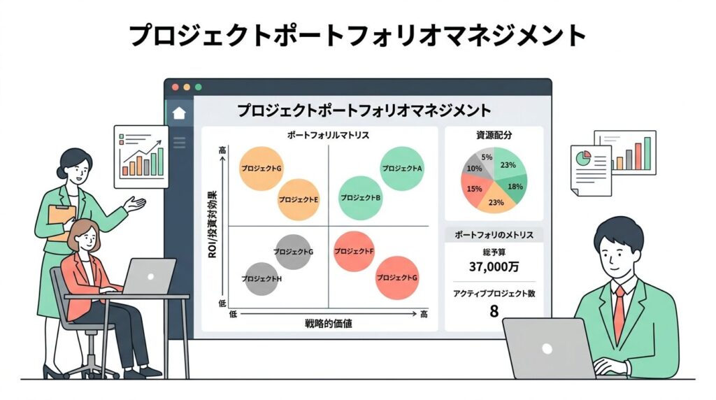 PPM(プロジェクトポートフォリオマネジメント)は、複数のプロジェクトを同時に一覧化し、予算・人員・期間を数値で配分して優先順位を決める手法です。まず進行中および計画中のすべてのプロジェクトを洗い出し、それぞれに対して予算額、必要人員数、開始日と終了日、期待される成果を数値で整理します。