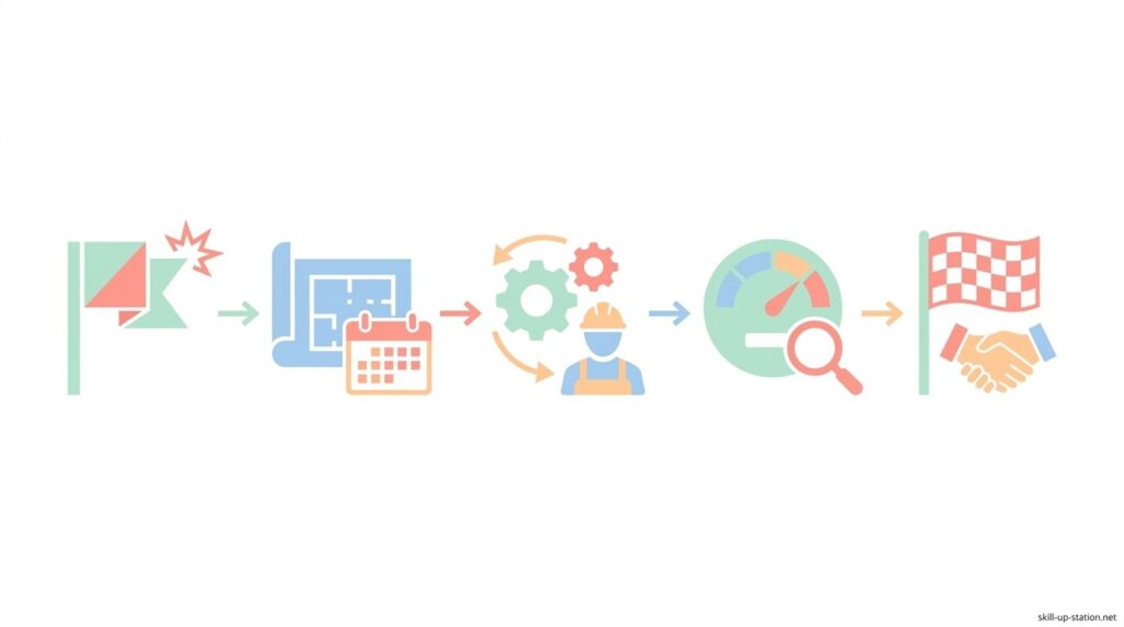 プロジェクトマネジメントは、「立ち上げ・計画・実行・監視・コントロール・終結」という5つのプロセスに分けて進めることで、作業の抜け漏れや判断の遅れを防ぐ仕組みになっています。