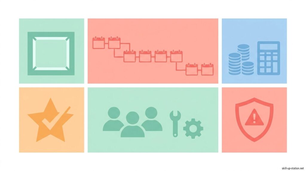 スコープでは作業範囲を項目単位で固定し、スケジュールでは日付単位で順序を決め、コストでは金額を具体的に算出し、リスクでは発生確率と対応方法を事前に定義します。