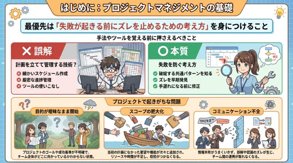 結論から言うと、プロジェクトマネジメントの基礎は「計画を立てて管理する技術」ではなく、「失敗が起きる前にズレを止めるための考え方」を身につけることが最優先です。