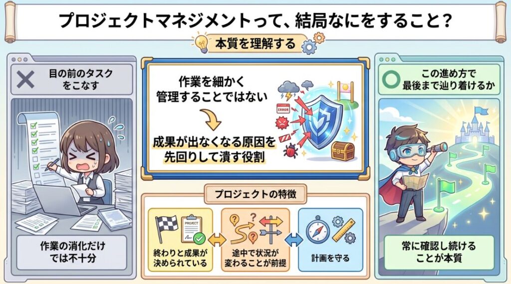 プロジェクトマネジメントは、作業を細かく管理することではなく、成果が出なくなる原因を先回りして潰す役割を担います。目の前のタスクをこなすことよりも、「この進め方で最後まで辿り着けるか」を常に確認し続けることが本質です。