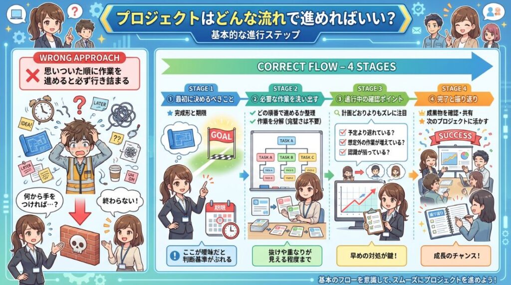 つまり、プロジェクトマネジメントとは「管理のための管理」ではなく、「失敗しないための準備と確認」を続ける仕組みです。この考え方を押さえるだけで、進め方そのものが大きく変わります。