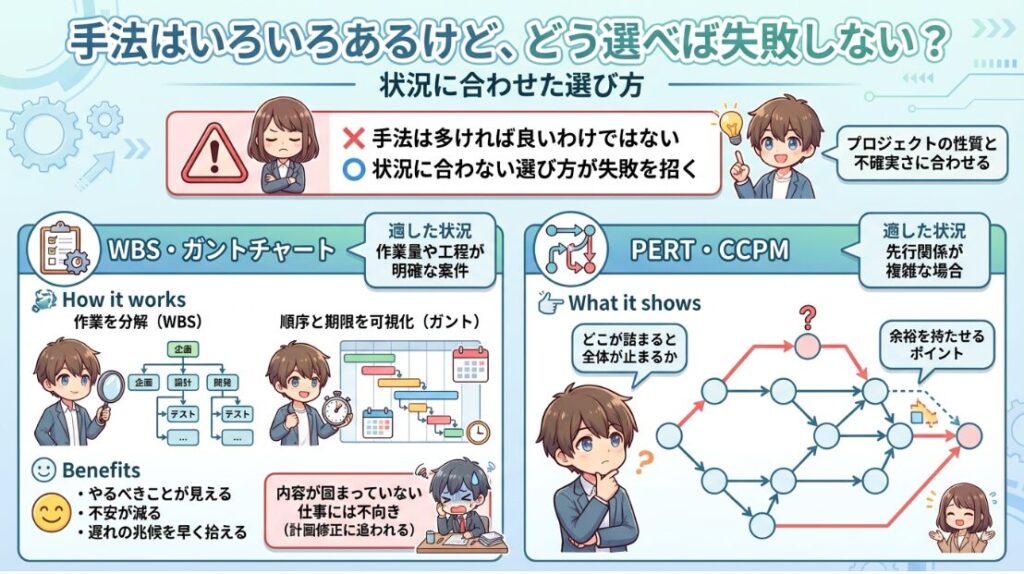 手法は多ければ良いわけではなく、状況に合わない選び方が失敗を招きます。大切なのは、プロジェクトの性質と不確実さの大きさに合わせて、無理のない型を使うことです。