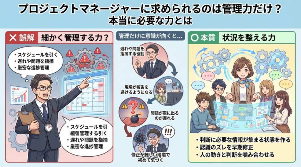プロジェクトマネージャーに必要なのは、細かく管理する力よりも、状況を整える力です。スケジュールを引くことができても、人の動きや判断が噛み合っていなければ、プロジェクトは止まります。
