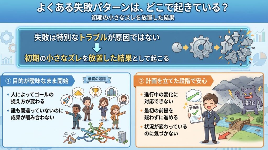 プロジェクトの失敗は、特別なトラブルが原因ではなく、初期の小さなズレを放置した結果として起こります。多くの場合、問題はすでに途中段階で表に出ています。