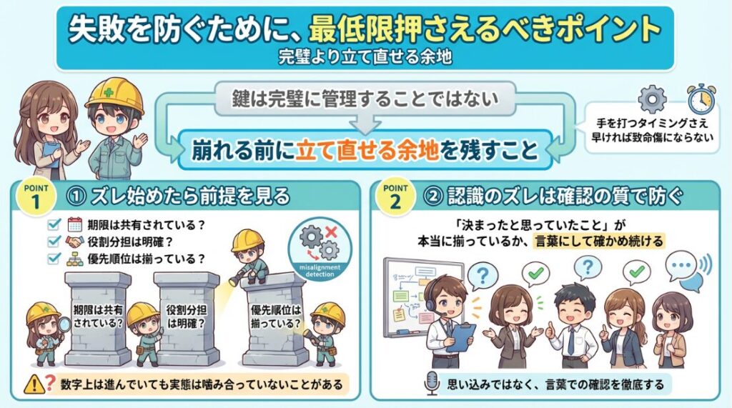 失敗を防ぐ鍵は、完璧に管理することではなく、崩れる前に立て直せる余地を残すことです。多くのプロジェクトは、手を打つタイミングさえ早ければ致命傷になりません。