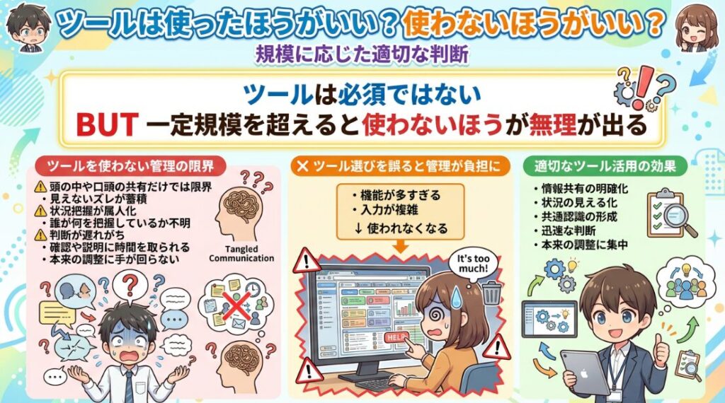 ツールは必須ではありませんが、一定規模を超えると使わないほうが無理が出ます。頭の中や口頭の共有だけで回せる範囲には限界があり、見えないズレが蓄積します。