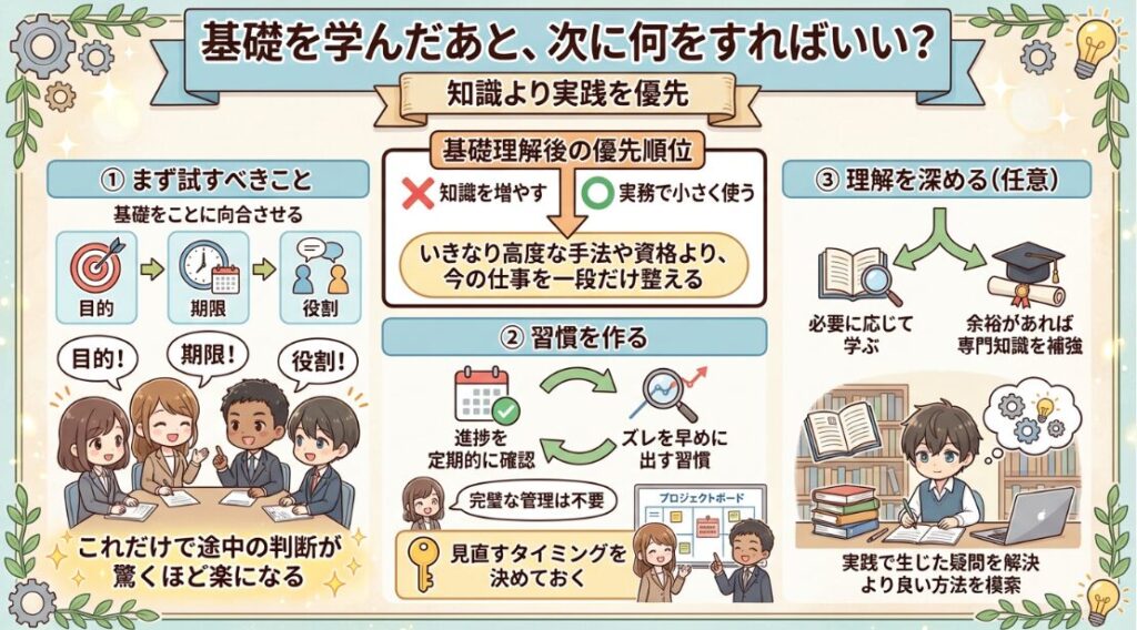 基礎を理解したあとは、知識を増やすよりも、実務で小さく使うことを優先すべきです。いきなり高度な手法や資格に進むより、今の仕事の進め方を一段だけ整えるほうが効果は出ます。