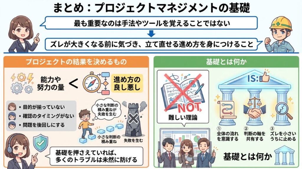 結論から言うと、プロジェクトマネジメントの基礎で最も重要なのは、手法やツールを覚えることではなく、ズレが大きくなる前に気づき、立て直せる進め方を身につけることです。