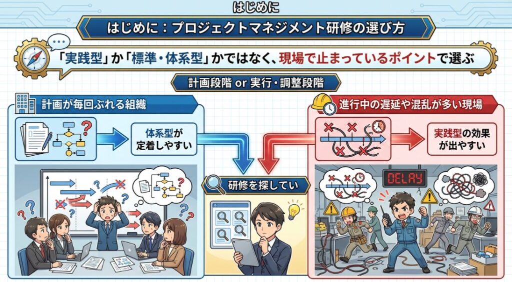 結論から言うと、プロジェクトマネジメント研修は「実践型」か「標準・体系型」かで迷うものではなく、現場で止まっているポイントが計画段階なのか、実行・調整段階なのかで選ぶと失敗しません。