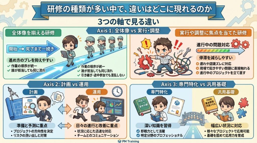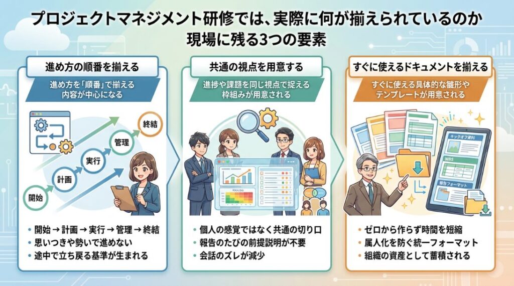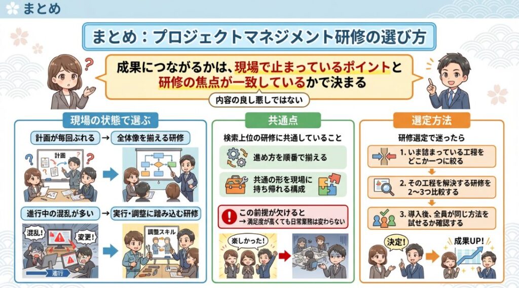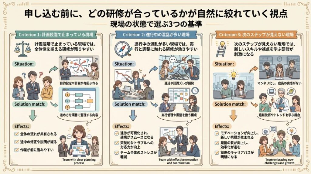 計画が毎回ぶれる現場では全体像を揃える研修が残りやすく、進行中の混乱が多い現場では実行や調整に踏み込む研修が機能します。
