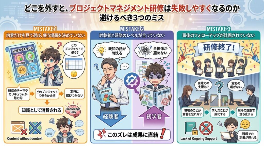 プロジェクトマネジメント研修が成果につながるかどうかは、内容の良し悪しではなく、現場で止まっているポイントと研修の焦点が一致しているかで決まります。