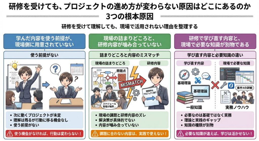 研修を受けても、プロジェクトの進め方が変わらない原因はどこにあるのか