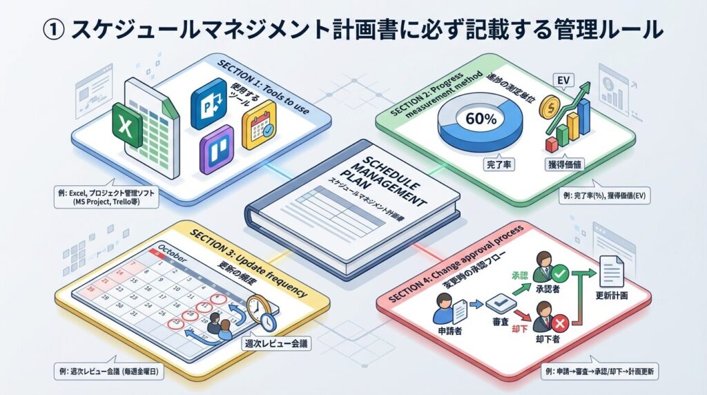 ① スケジュールマネジメント計画書に必ず記載する管理ルール