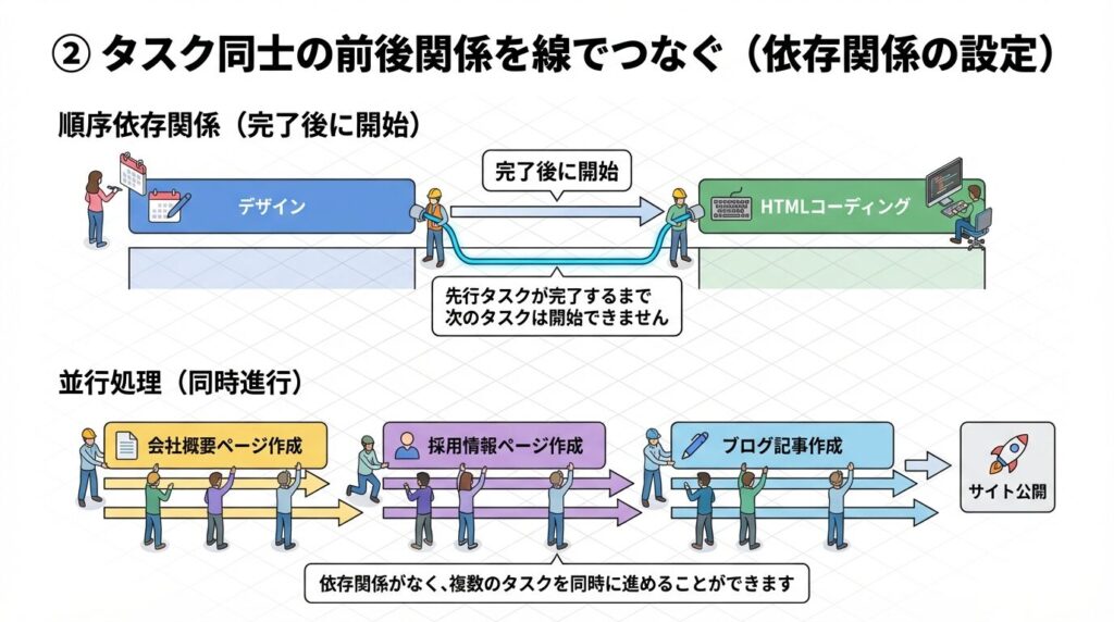 次に、各作業をどの順番で実行するかを決めます。たとえばトップページのデザインが完了していないとHTMLコーディングを始められない場合は、「デザイン完了後にコーディング開始」と設定します。逆に、会社概要ページの作成のように同時に進められる作業は並行タスクとして登録し、ガントチャート上で前後関係を線で結びます。