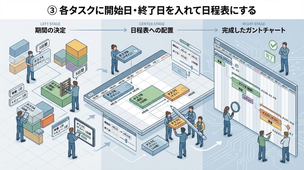 ③ 各タスクに開始日・終了日を入れて日程表にする