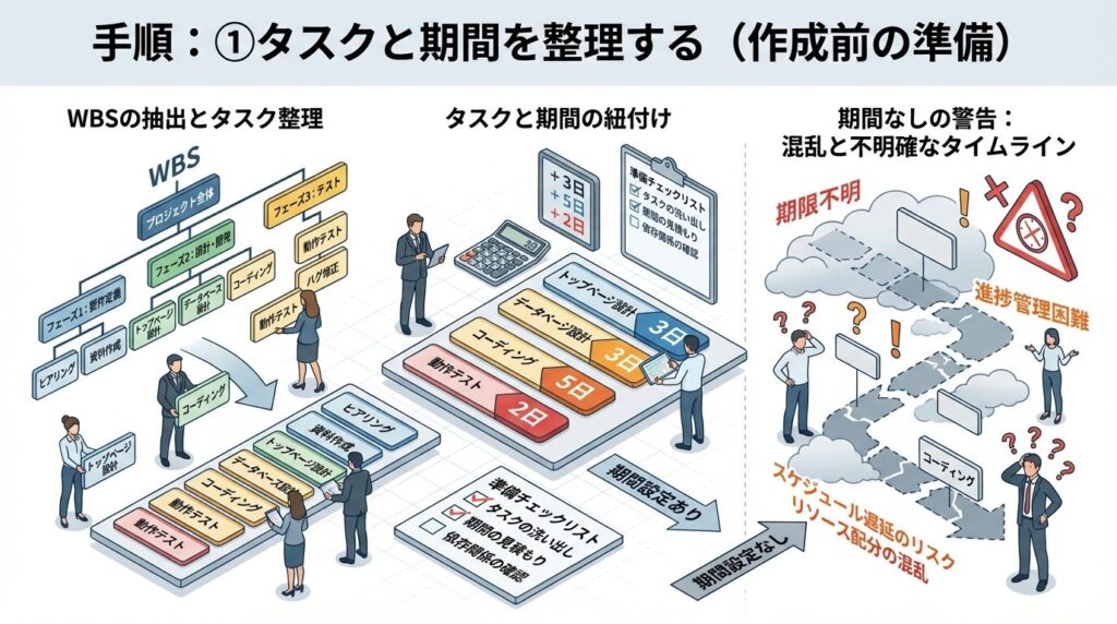 WBSで作業を細かく分解できても、そのままでは実行に使える日程表にはなりません。実務では、WBSをもとに作業の順番や期間を整理し、ガントチャートなどのスケジュール形式へ落とし込む工程が必要になります。ここでは、WBSをどのように並べ替え、依存関係を設定し、最終的な日程表に変換していくのかを、具体的な手順に沿って整理します。