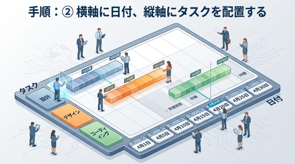 次に、横軸に4月1日〜4月30日などの日付、縦軸に「設計」「デザイン」「コーディング」といったタスク名を並べます。各タスクに開始日と終了日を入力すると、期間が横棒で表示されます。複数のバーを並べると、同時に動いている作業や作業が入っていない日が画面上で確認できます。