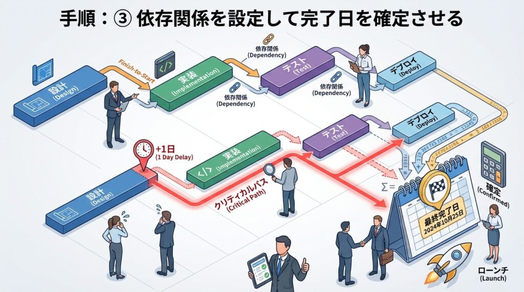 設計が完了しないと実装を始められない場合は、ガントチャート上で設計タスクと実装タスクを矢印で結びます。この直列のつながりが長いと、設計が1日遅れるだけで公開日も1日後ろにずれます。すべての前後関係を設定すると、最終的な公開日が日付で確定します。